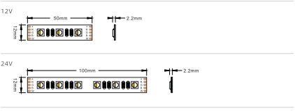 12V | 5M | 12MM | 2.20MM | Every 50MM(3 LEDs) |